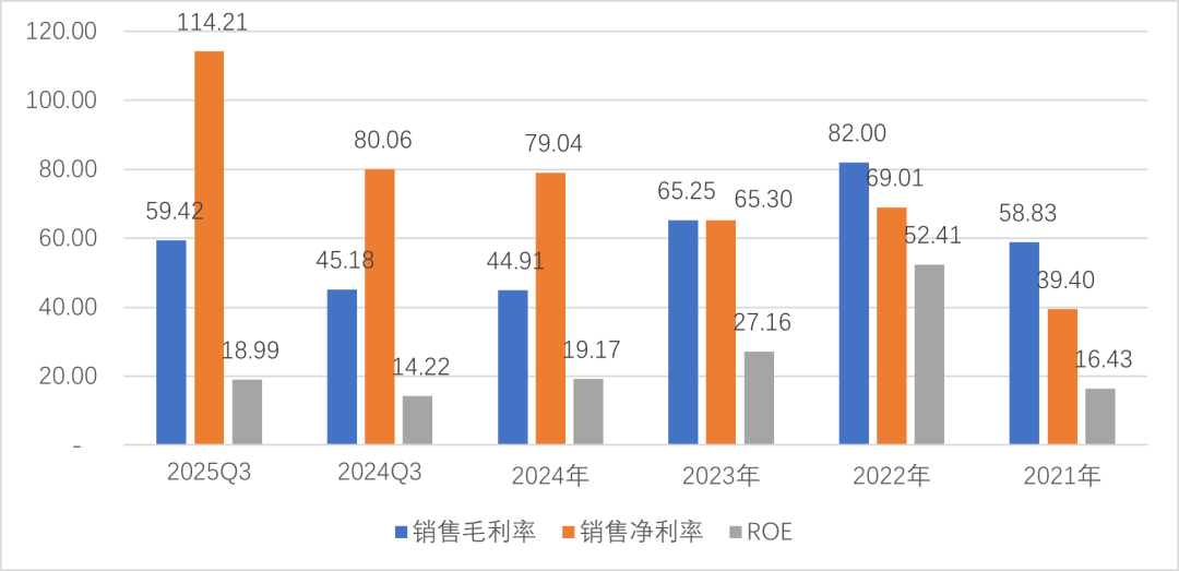 藏格的ROE在2022年达到52.41%,为近年最高。23年起投资收益(绝大部分为巨龙铜矿项目)对净利润影响权重显著增加,造成销售净利率畸高。25年前三季度ROE为18.99%,年化后即25.32%。