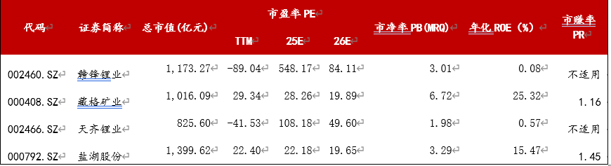 选取锂板块上市公司进行估值比较,藏格矿业与盐湖股份可比性最强。两者同为青海、西藏盐湖区的钾、锂巨头,开采成本约3-4万元/吨,远低于锂辉石提锂(5.5-8万元/吨)和锂云母提锂(6-13万元/吨)。两家公司2026年预期市盈率基本相当,藏格矿业的市净率更高,但从市赚率(PR)角度看,藏格矿业占优。