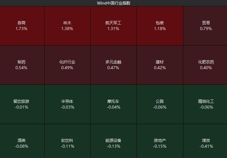 盘面上,券商、航天军工等板块涨幅居前,贵金属、煤炭、房地产板块相对疲软。