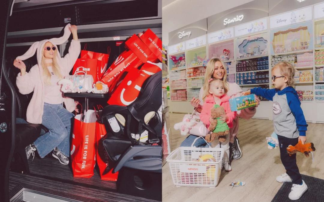 图说:帕里斯·希尔顿与子女在MINISO洛杉矶门店购物