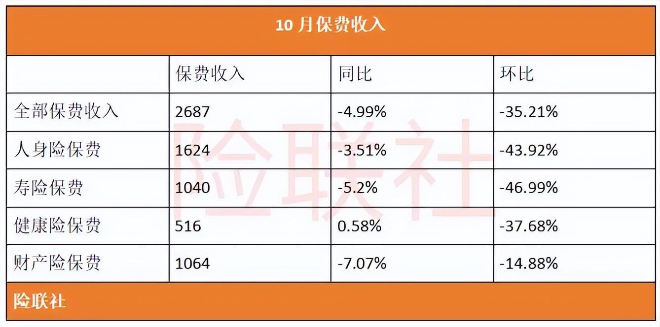 10月单月保费数据呈现出断崖式下跌的态势。全行业保费收入为2687亿元,相较于9月的4147亿元,大幅下降了35%。其中,人身险板块的表现尤为突出,10月保费为1624亿元,环比下降44%,寿险单月保费更是从1962亿元急剧降至1040亿元。