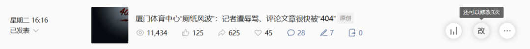 以传媒见闻上周二发布的一篇文章为例,后台显示该篇文章已可进行三次修改,支持调整的内容包括标题、正文文字、图片、视频、封面及摘要。