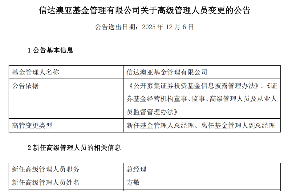在信达澳亚基金总经理职位确认之前,曾发布两则公告涉及方敬的职务变更:10月14日,方敬成为信达澳亚基金新任财务负责人;10月17日,经深圳市市场监督管理局核准,信达澳亚基金法定代表人变更为方敬。