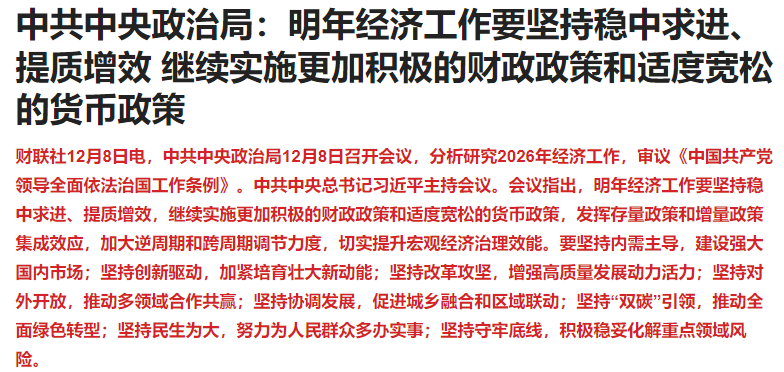 今天zzj会议召开,盘中发布通稿,会议强调明年经济工作要坚持稳中求进、提质增效,继续实施更加积极的财政政策和适度宽松的货币政策。