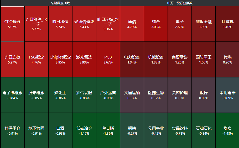 分行业来看,通信、综合、电子、非银金融、计算机等行业领涨,煤炭、石油石化、食品饮料等行业下跌。