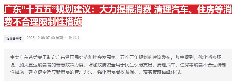 中共广东省委关于制定广东省国民经济和社会发展第十五个五年规划的建议发布。其中提到,优化消费环境,加大直达消费者的普惠政策力度,增加政府资金用于民生保障支出,清理汽车、住房等消费不合理限制性措施,建立健全适应新消费的管理办法,强化消费者权益保护,落实带薪错峰休假。