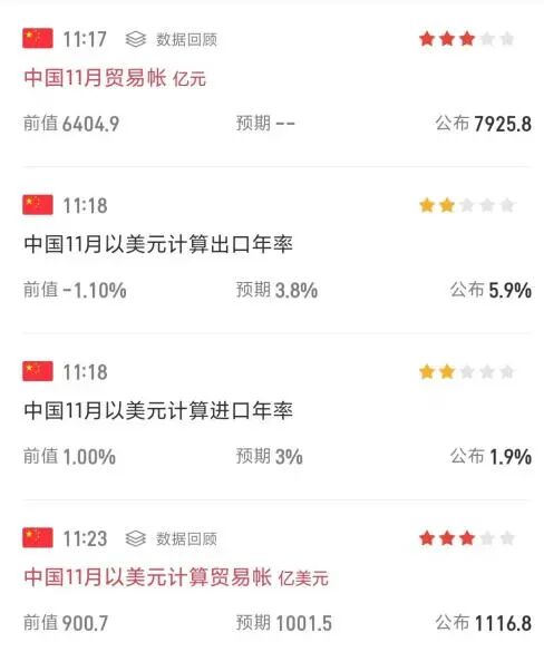 据海关数据,中国11月以美元计价出口同比增长5.9%,大幅超出市场预期的3.8%;11月以美元计价进口同比增长1.9%,低于市场预期3%。