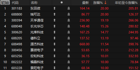 今天最强的是光通信,特别是上游光芯片、cw光源、隔离器、法拉第旋光片等细分领域,东田微、瑞可达、福晶科技等多股涨停,天孚通信盘中一度涨停创历史新高,之前我也提示过明年光芯片、隔离器等环节紧缺。