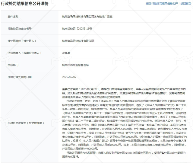 2025年6月16日,杭州盒马网络科技有限公司(下称盒马杭州)因饲料广告使用专业人士做推荐、证明,被处以罚款10万元。据公告,杭州市市场监督管理局在日常网络监测中,发现杭州盒马网络科技有限公司经营的某洁齿棒商品详情页,存在宣称“兽医推荐” 的内容。经调查,广告中利用专业人士名义作推荐、证明” 的规定,构成违法。