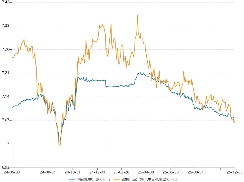 11月27日,人民币中间价为7.0779,而人民币离岸价格为7.0769,人民币中间价弱于人民币离岸价格。11月28日,12月01日,12月02日,12月03日,12月04日12月05日,人民币中间价格也持续弱于人民币离岸价。