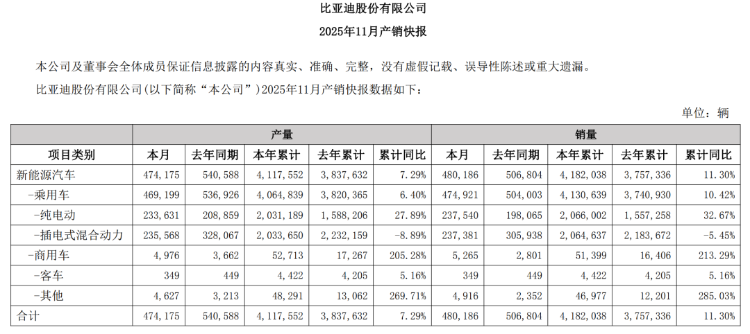 据比亚迪公布的数据显示,2025年11月比亚迪新能源汽车销量为48.0万辆,同比下滑5.3%,其中新能源乘用车销量为47.5万辆,同比下滑5.8%。截至11月底,比亚迪新能源汽车累计销量418.2万辆,同比增长11.3%,其中新能源乘用车销量为413.1万辆,同比增长10.4%。不过,据统计,如果剔除海外销量,比亚迪单月销量已经连续7个月同比下滑,前11月销量则同比下滑4.8%。