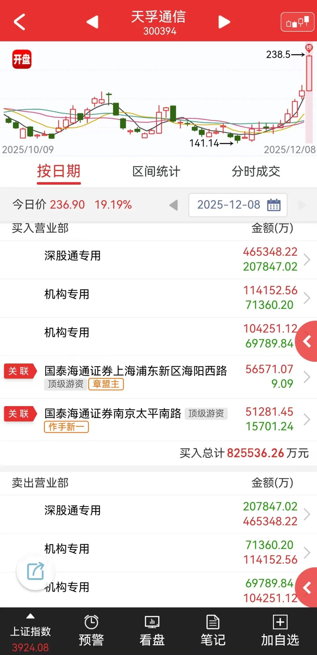 5)天孚通信逼近20cm涨停,且股价创历史新高背后。知名游资章盟主和作手新一疯狂杀入,章盟主净买入5.6亿,而左手新一净买入3.6亿。此外,还有不少机构杀入。