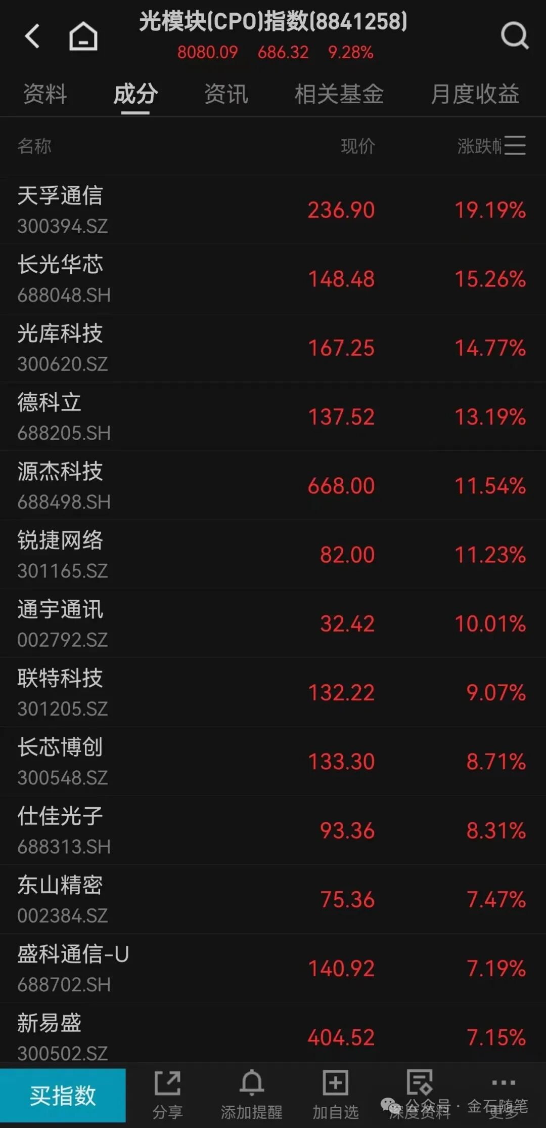 算力巨头和光通信炸裂上涨, 天孚通信触及20cm涨停, 光库科技、长光华芯、源杰科技、联特科技等多股涨逾10%。新易盛逼近历史新高,天孚通信和中际旭创创历史新高。