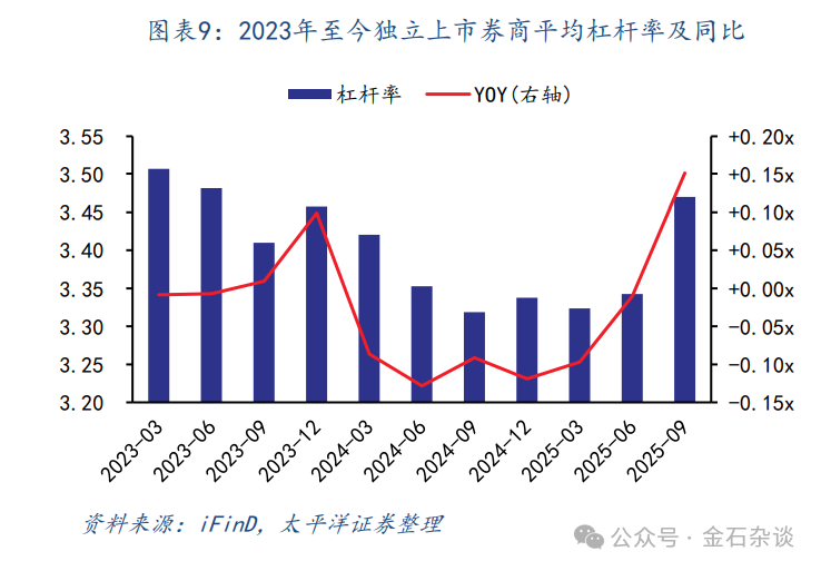据太平洋证券,截至2025第三季度,42家独立上市券商平均杠杆率为3.47倍,较年初增加0.13%、环比增加0.13%。另据统计,中信证券杠杆率为4.3倍,国泰海通4.5倍,但高盛杠杆率为14.4倍,摩根士丹利为12.5倍。