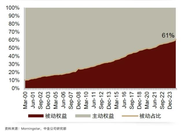 美国,全球最成熟的资本市场,亦是如此。过去20多年,被动权益占比不断提升,到2024年末已超过60%。