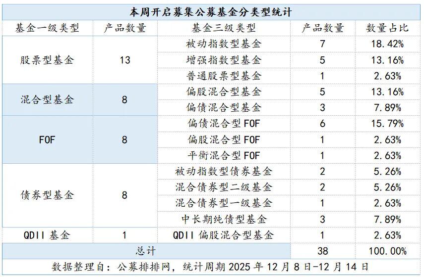 12月8日,公募排排网数据显示,本周(12月8日至12月14日)有38只新基开启募集,数量与前一周基本持平,已连续两周维持在较高水平。