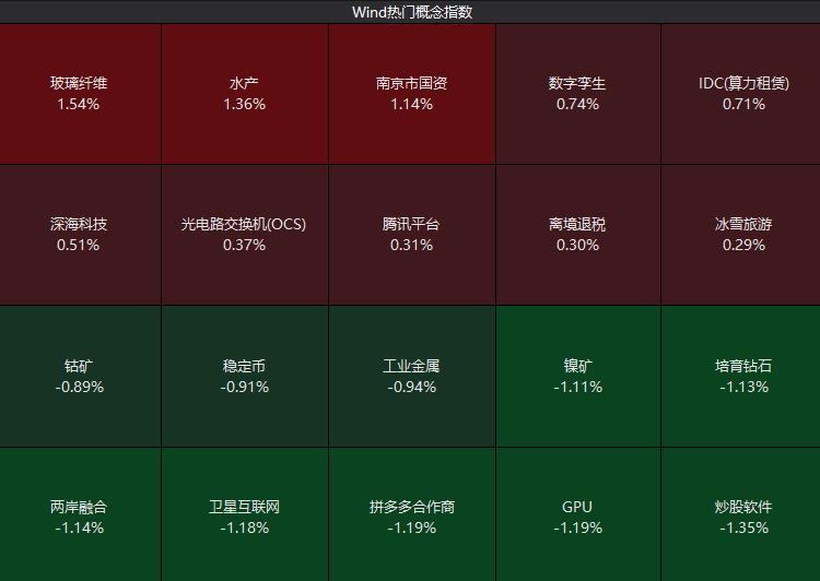 盘面上,玻璃纤维、船舶制造等板块涨幅居前,贵金属、能源金属、有色金属等板块普遍回落。