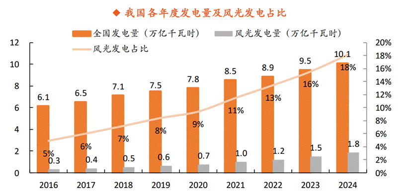 近年来新能源发电占比与日俱增,而新能源利用率却有所降低,2025上半年我国弃风率6.6%、弃光率5.7%,同比有所抬升,推动储能装机需求不断增加。