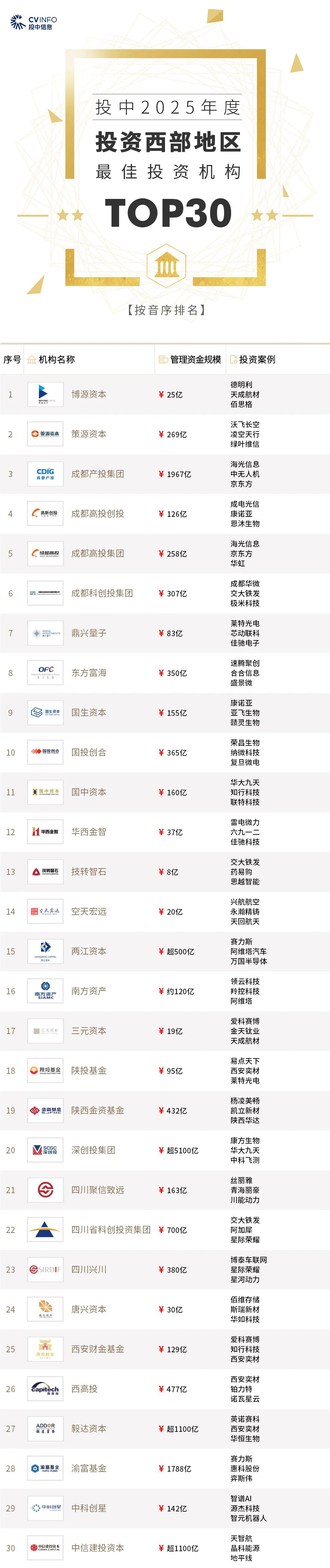 投中信息于今日重磅发布“投中榜·2025年度投资西部地区最佳投资机构榜单”。该榜单对近200余家在我国西部地区(包含重庆、四川、贵州、云南、西藏、陕西、甘肃、青海、宁夏、新疆、内蒙古、广西)进行布局的股权投资机构进行了调研,采取了定量与定性相结合的方式,依据在管规模、投资及退出等评选指标对选取机构进行评定,经过初选、信息核实及最终排名等环节,并综合考量机构的市场影响力及声誉度,最终根据分数选定符合条件的投资机构入榜。