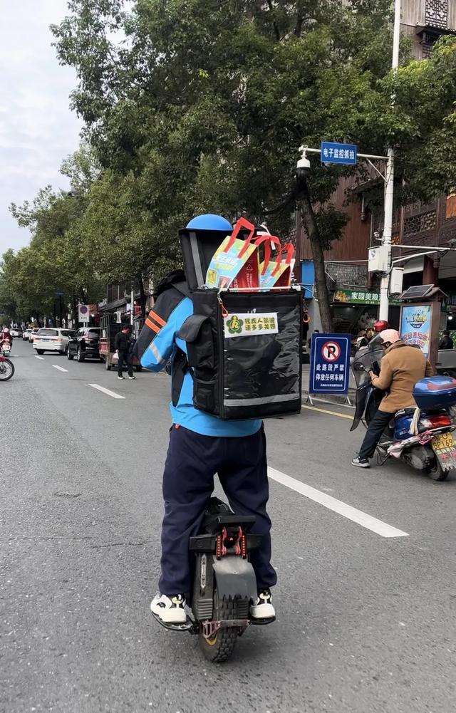 取餐后,他用下巴和肩膀夹住手机,确认订单信息,然后再跳上独轮平衡车。