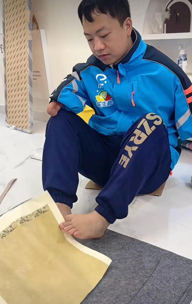 顾客的反应则更为直接。当他用小臂夹着餐品,或者请顾客自己从外卖箱里取出时,对方往往会先是惊讶,随即化为一句温和的“谢谢”。送餐的路上,大人看到他,转身对身边的孩子说:“你看这个叔叔,在靠自己的劳动生活,不偷不抢,多了不起。做人就得像他这样。”