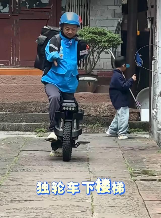 送完餐后的路上,遇到台阶,在确认高度适宜后,他会连人带车,从几级台阶上一跃而下,车轮落地时发出沉稳的“砰”的一声,整个过程不到一秒。