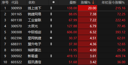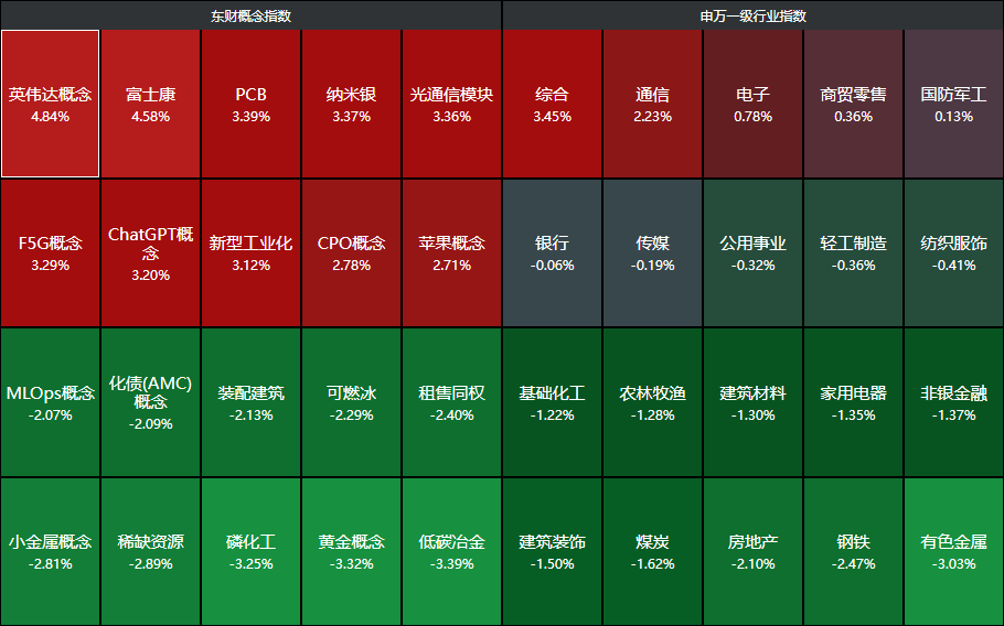 分行业来看,综合、通信、电子、商贸零售、国防军工等行业领涨,有色金属、钢铁、房地产、煤炭、建筑装饰等行业领跌。