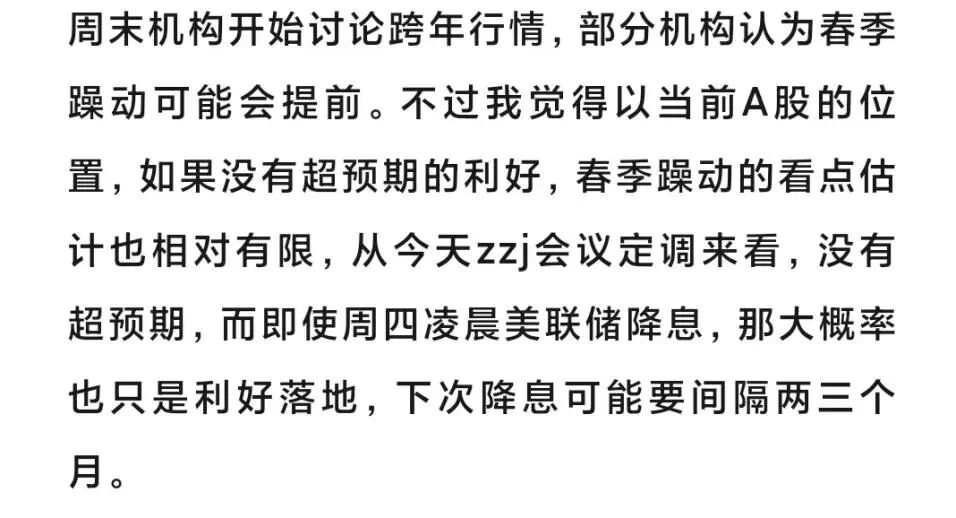 本周还有两个会议:一个是经济工作会议,但应该不会比zzj会议超预期很多;另一个是周四凌晨的美联储议息会议,降息是大概率的,但即使降息也可能是鹰派降息,而且明年上半年可能只有两次降息,也就是说下次降息可能有两三个月的间隔,所以这大概率也会是利好落地。短期内,本周应该是个兑现点,要警惕美联储降息后美元指数触底反弹。
