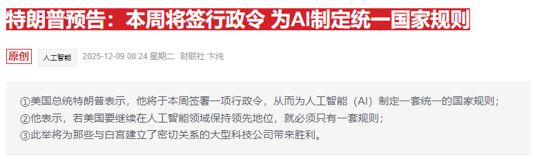 当地时间周一,美国总统特朗普表示,他将于本周签署一项行政令,为人工智能(AI)制定一套统一的国家规则。