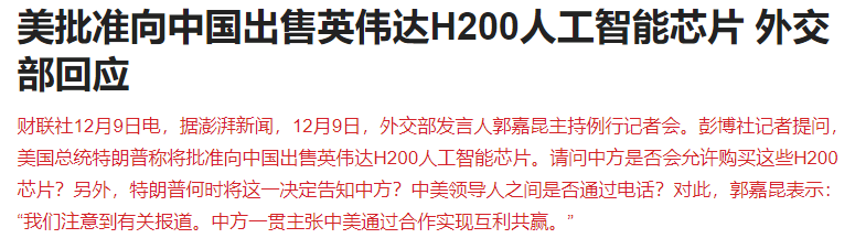 盘前就有报道,美国政府将允许英伟达向中国出售其H200人工智能芯片,但对每颗芯片收取一定费用。《纽约时报》称,H200芯片为英伟达“性能第二强”的芯片。特朗普表示,美方将从相关芯片出口中收取25%的分成。