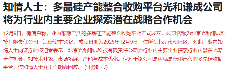 据报道,业内酝酿已久的多晶硅产能整合收购平台正式成立,公司名称为北京光和谦成科技有限责任公司,注册资本30亿,成立日期为2025年12月9日,住所在北京市朝阳区。对此,业内知情人士向证券时报记者表示,北京光和谦成科技有限责任公司为行业内主要企业探索行业内潜在战略合作机会,如技术升级、市场拓展、产能与成本优化。但对于该公司是否就是酝酿已久的多晶硅收储平台,该知情人士并未作明确回应。
