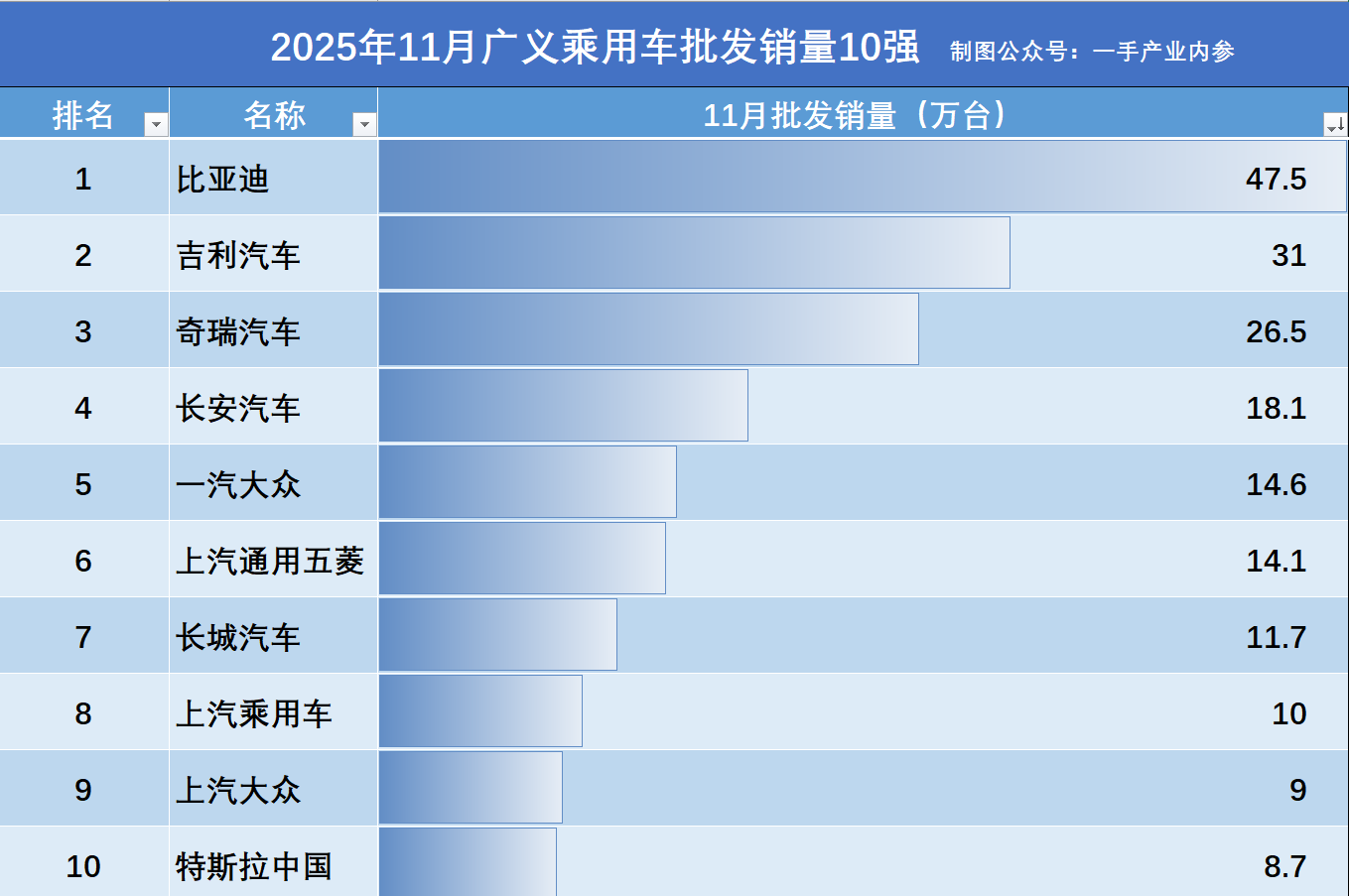 另附:2025年11月我国乘用车批发销量10强厂商,数据源于:乘联分会。