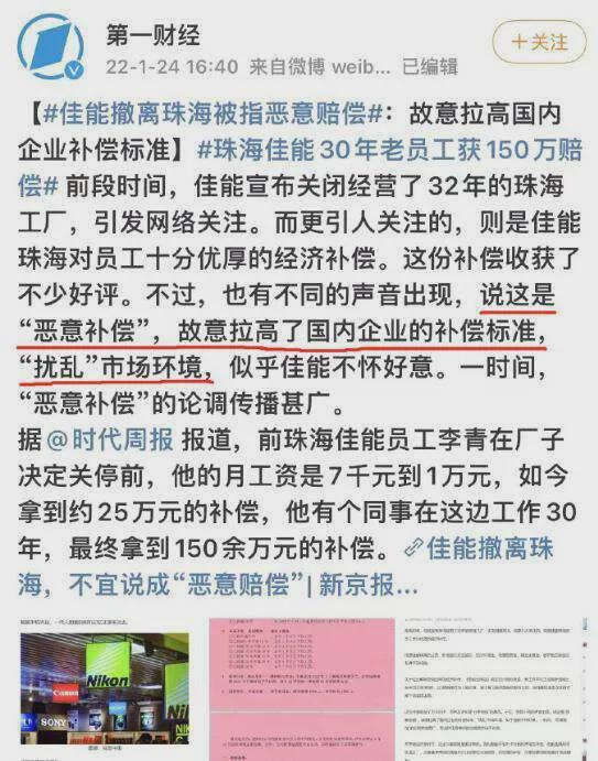 早在2022年,佳能珠海工厂关停,30年工龄员工拿150万补偿时,就有类似声音,说“这是在给其他企业找麻烦”,“拉高了国内企业的赔偿标准,‘扰乱’市场环境。”