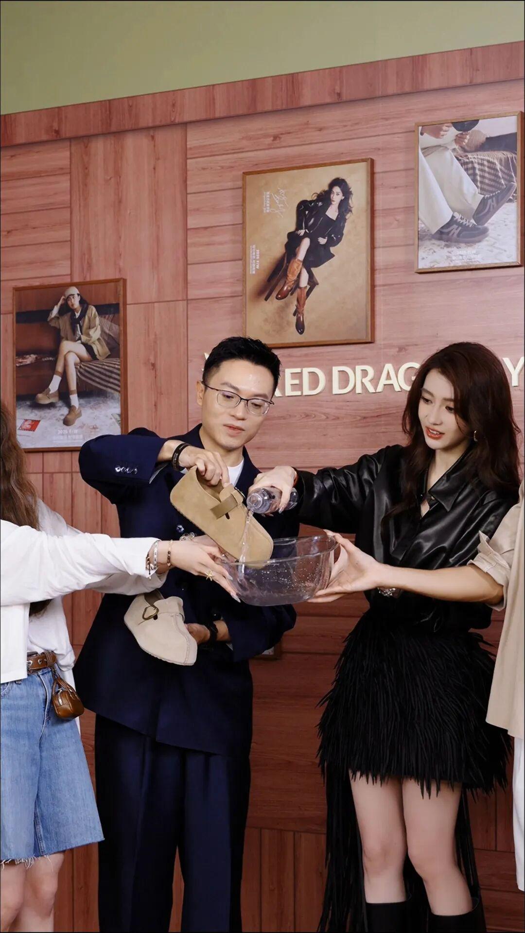 *红蜻蜓直播间展示鞋子的防水抗污功能