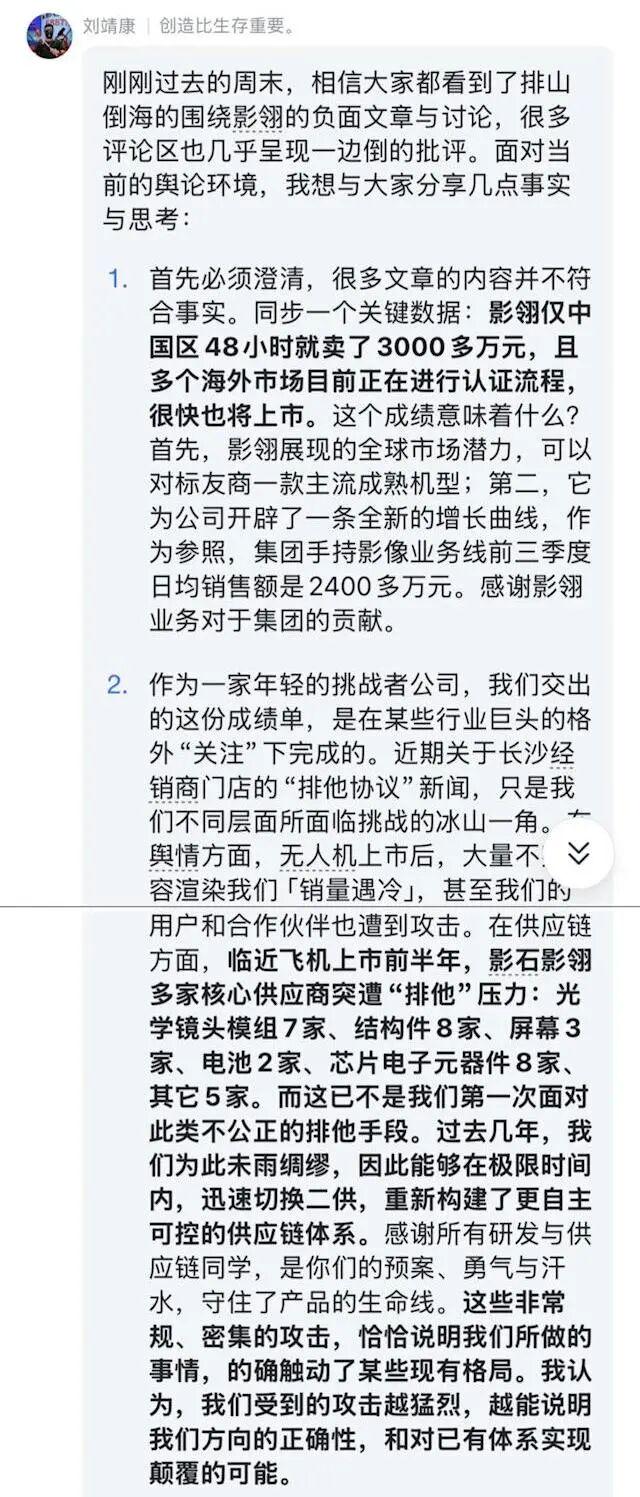肯定影翎A1业绩表现的同时,刘靖康还提及了与“某些行业巨头”的竞争问题。刘靖康称,在无人机产品上市前半年,公司多家核心供应商遭遇“排他压力”,涉及光学镜头模组、结构件、屏幕、电池、芯片电子元器件等供应商。为此,公司“切换二供”,重建自主供应链。同时,刘靖康也表示,激烈竞争客观上推动了市场扩容。
