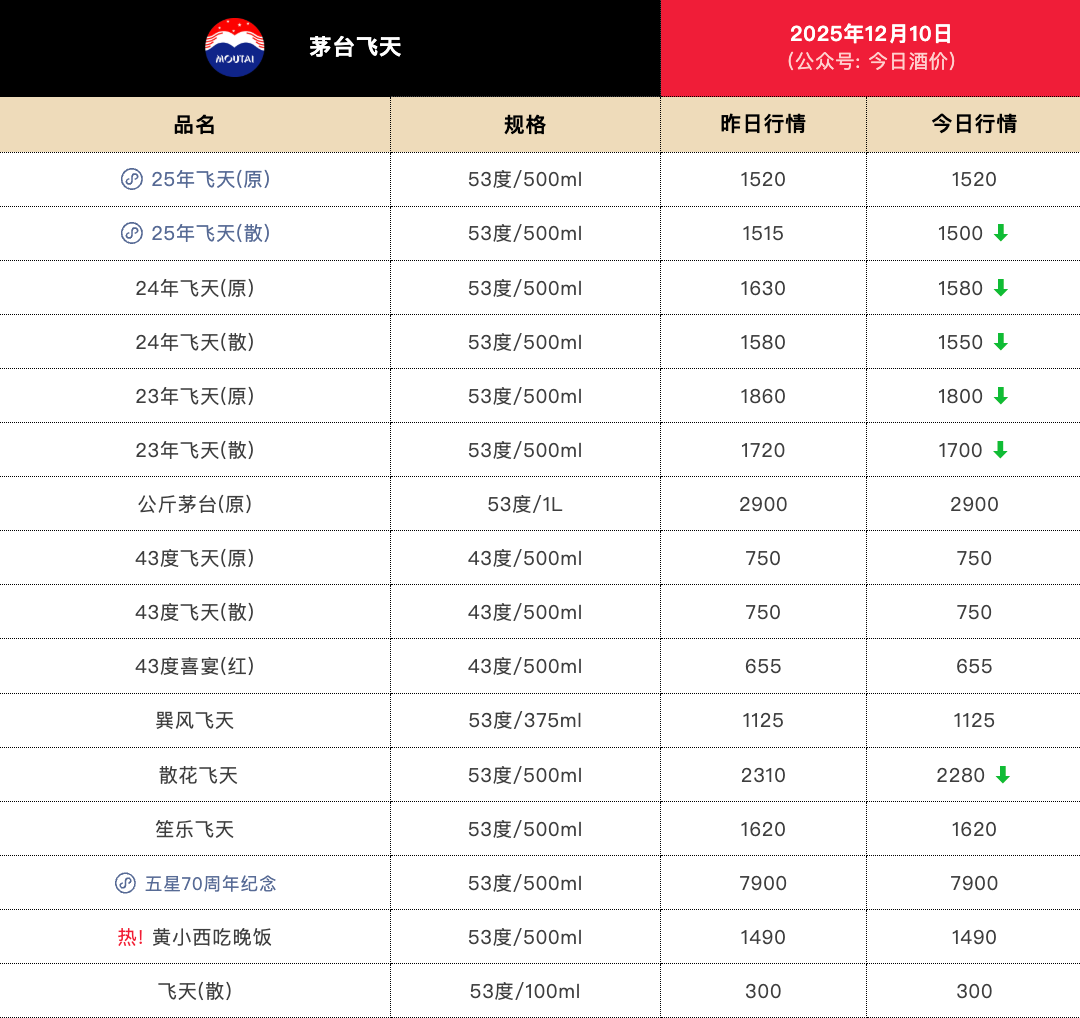 今日酒价披露的批发参考价显示,12月10日,25年飞天茅台散瓶较前一日下跌15元,报1500元/瓶,回归指导价。25年飞天茅台原箱较前一日维持不变,报1520元/瓶。
