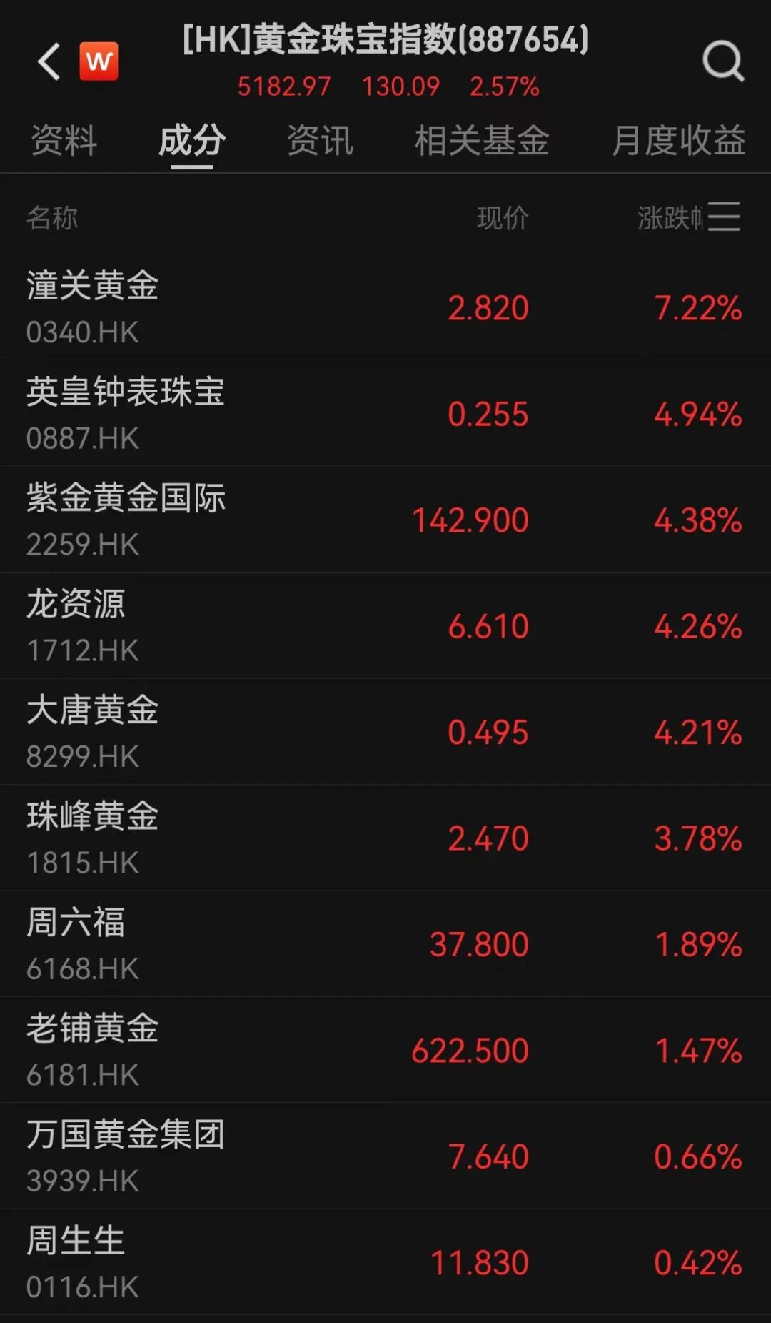黄金股普涨,潼关黄金涨超7%,紫金黄金国际、大唐黄金涨超4%,周六福、老铺黄金涨超1%。