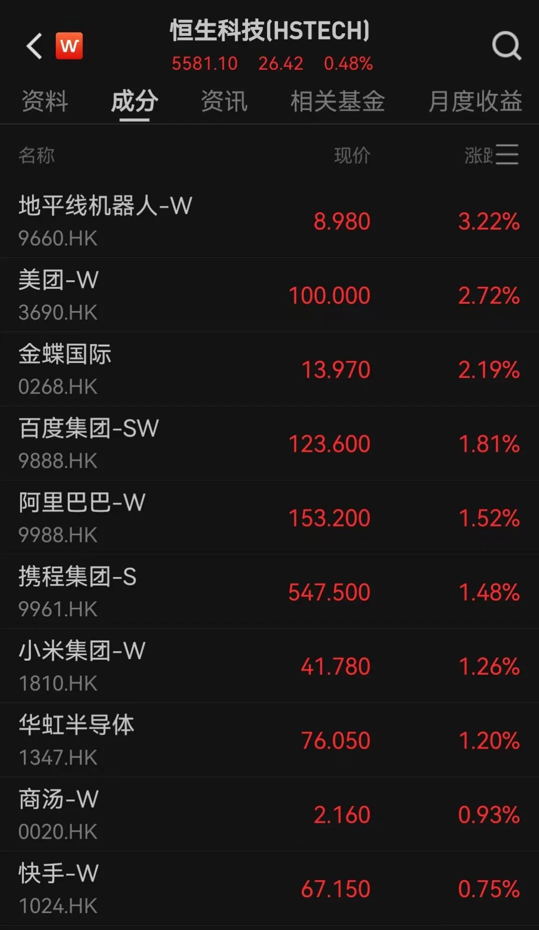 地平线机器人涨超3%,美团涨超2%,百度集团、阿里巴巴、小米集团等涨超1%。