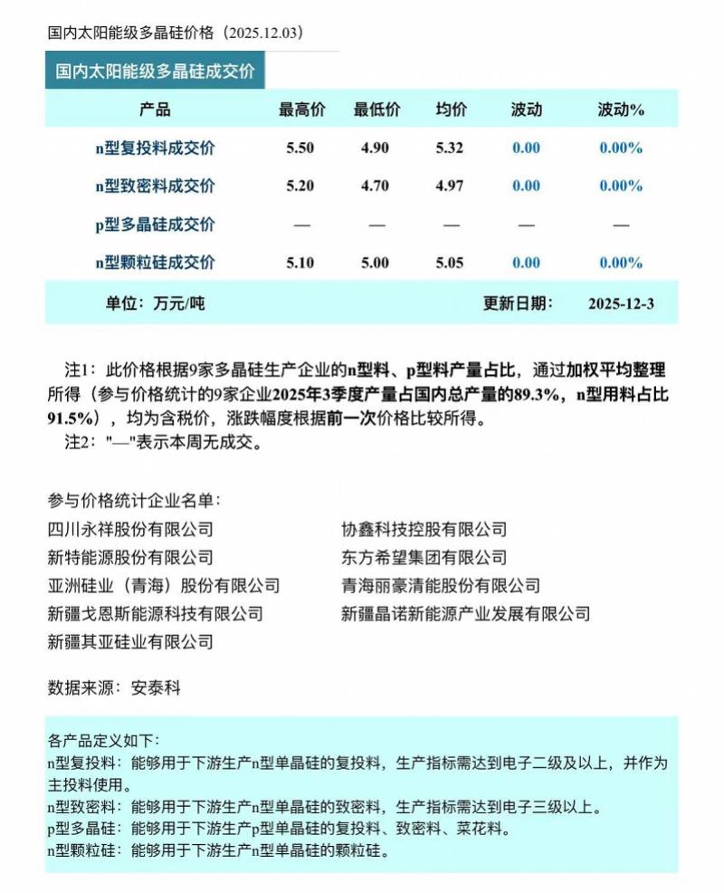 2025年7月初以来随着光伏“反内卷”推进,为符合“不低于成本销售”的价格法规要求,多晶硅价格有所回升。目前,多晶硅价格已连续多周稳定在5万元/吨附近。据硅业分会12月3日发布的数据,多晶硅n型复投料成交均价为5.32万元/吨,环比持平;n型颗粒硅成交均价为5.05万元/吨,环比持平。