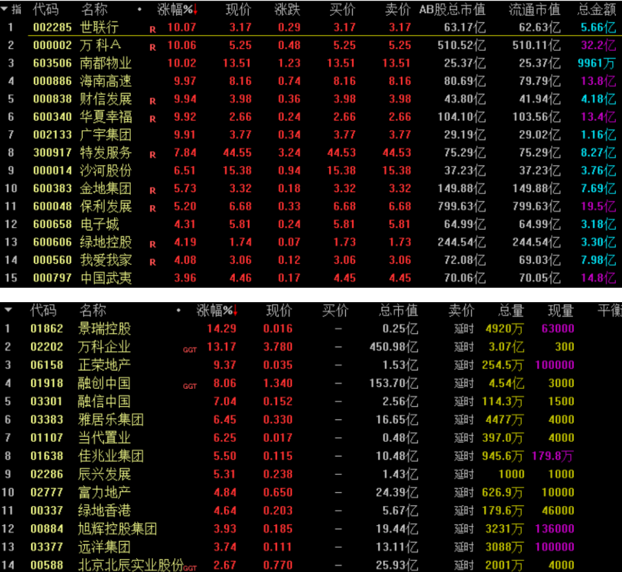 行情由龙头房企万科引爆,其A股午后强势封上涨停板,成交额突破30亿元;H股万科企业盘中涨幅一度超过18%。受此提振,截至收盘,A股市场中,世联行、财信发展、华夏幸福等多只地产股集体涨停,保利发展、金地集团等涨幅均超5%。港股内房股同步走高,截至收盘,万科企业股价涨超13%,正荣地产、融创中国涨超8%,融信中国、雅居乐集团、当代置业等涨超5%。