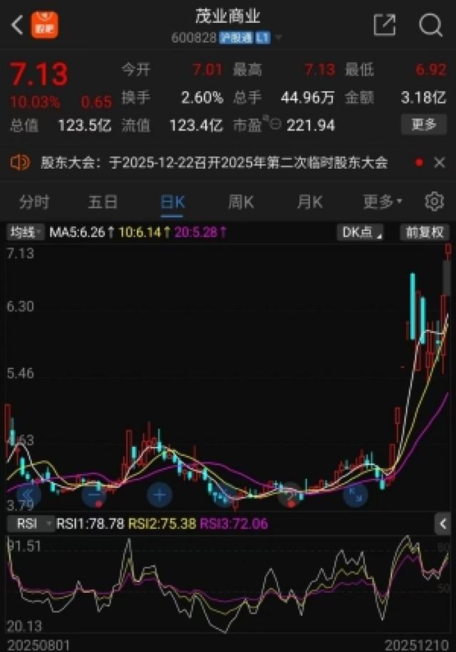 回溯近期走势,茂业商业的股价爆发力十足。自11月25日起,公司股价开启快速上涨模式,11月25日至28日连续4个交易日涨停,12月2日再度斩获涨停板。截至12月10日收盘,茂业商业的股价为7.13元/股,相较于11月24日4.2元/股的收盘价,公司仅用12个交易日便实现了69.76%的累计涨幅,成为资本市场的“香饽饽”,短期股价表现堪称板块标杆。