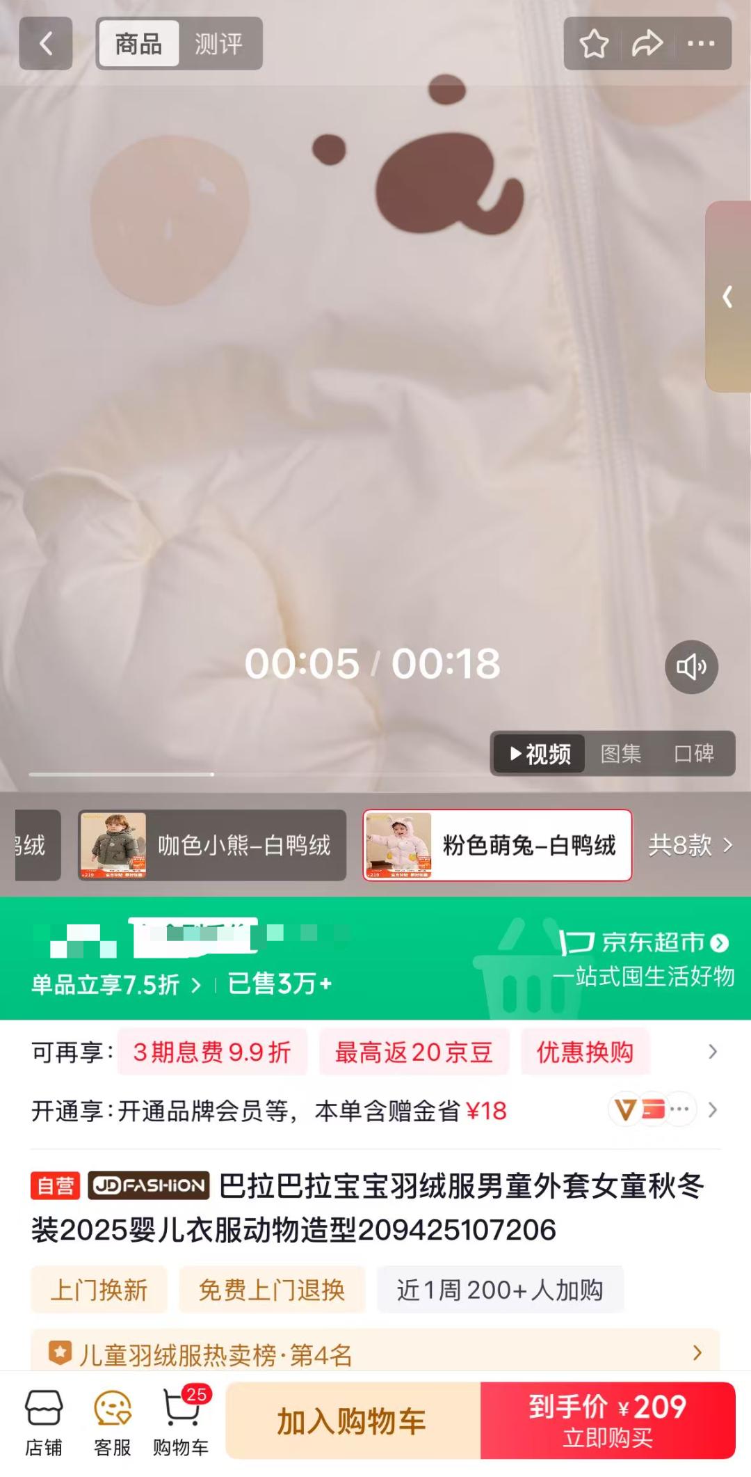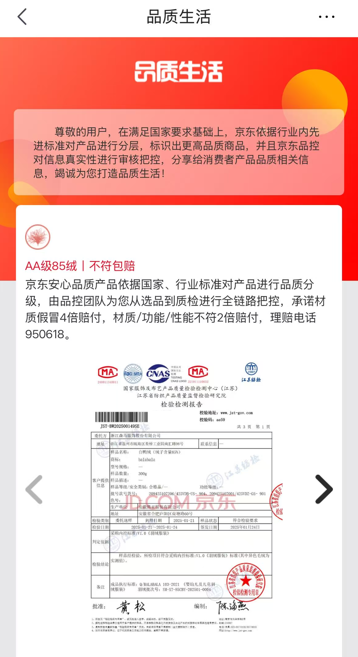 在京东的严格筛选下,羽绒服的含绒量、蓬松度等参数,经得起专业检测,巴拉巴拉们页面标注的“AA级 85绒”附带权威质检报告,既能让消费者买得放心,也为品牌的品质做了无形背书。