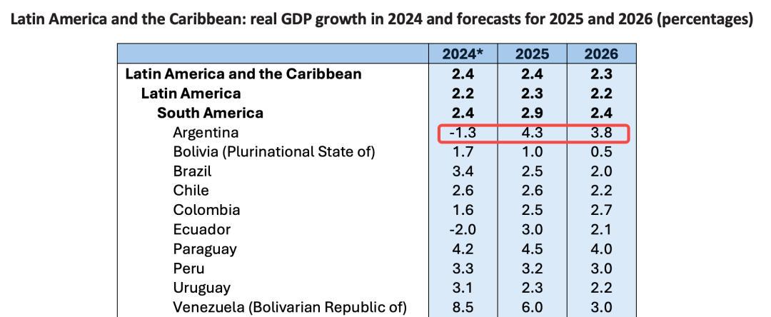 Economic Commission for Latin America and the Caribbean (CEPAL) 的2025年报告展望中,阿根廷在南美国家中被列为增长最快,其 2025年GDP增速预测为约4.3%。并且,在未来1–2年的区域增长预期中,阿根廷被广泛视作西半球表现最亮眼的经济体。
