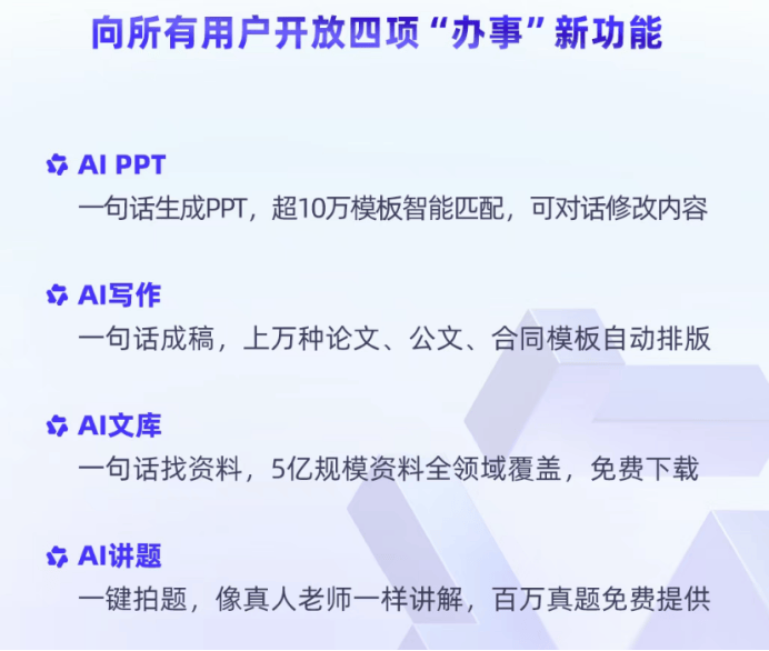 那就是首次在更新中推出的四项新功能:AI PPT、AI写作、AI文库、AI讲题。