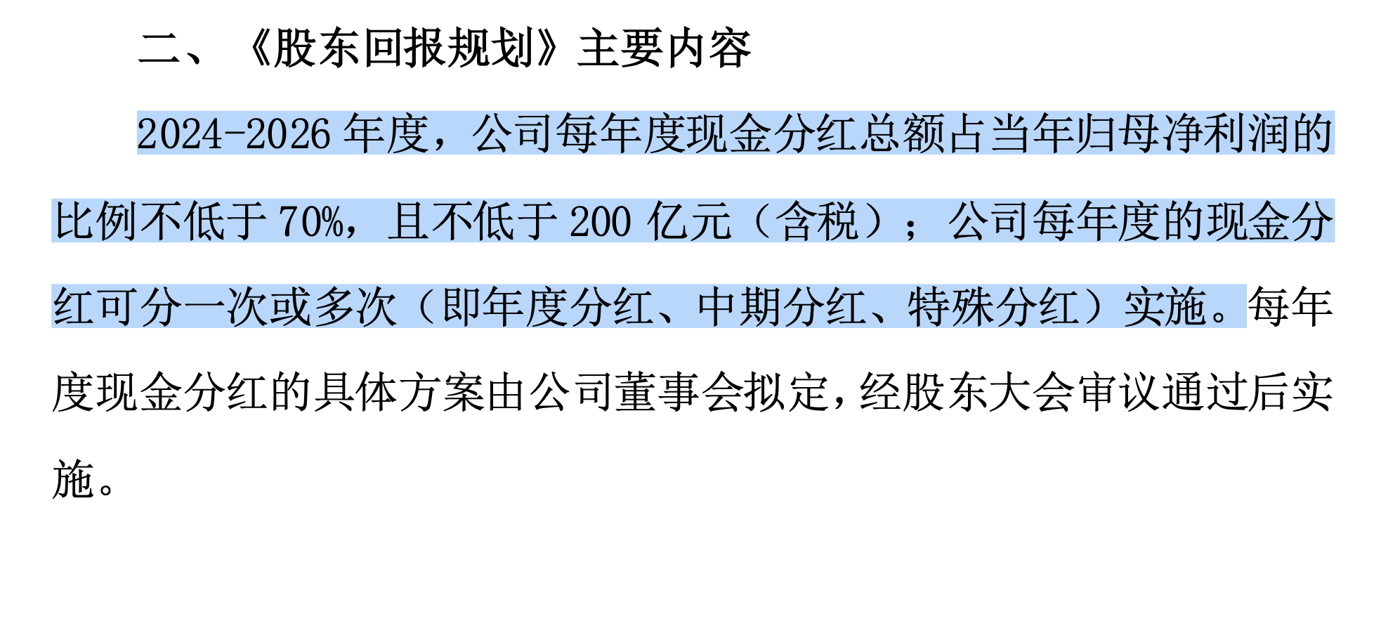 洋河股份(002304.SZ)此前也表示,2024年-2026年度,每年度现金分红总额不低于当年实现归属于上市公司股东净利润的70%,且不低于70亿元(含税)。
