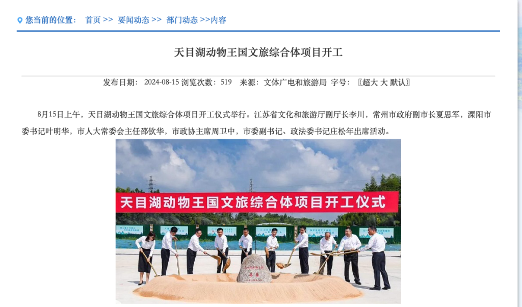 溧阳市人民政府官网信息显示,2024年8月15日上午,天目湖动物王国文旅综合体项目开工仪式举行。江苏省文化和旅游厅副厅长李川,常州市政府副市长夏思军,溧阳市委书记叶明华,市人大常委会主任邵钦华,市政协主席周卫中,市委副书记、政法委书记庄松年出席活动。