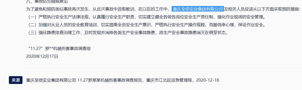 2020年11月27日22时15分左右,在江北区鱼复工业园区重庆至信实业集团有限公司发生一起机械伤害事故,导致修模工当场死亡,直接经济损失136万元。2020年3月,该公司还对违反操作规程3名工人李杨陈给予了解除劳动合同的处理,并给予相关的4名管理人员降级或者负绩效200元至800元的处理。