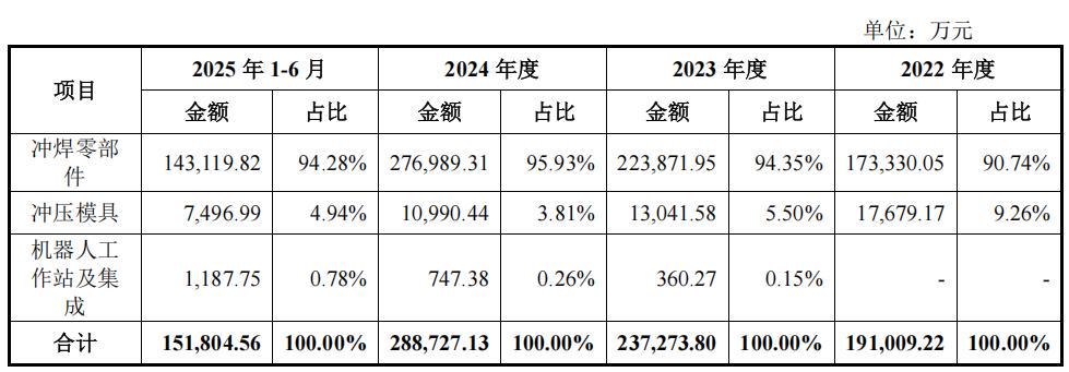 报告期内,至信股份的主要产品为冲焊零部件和冲压模具,其中冲焊零部件占比较高。2022年-2025年1-6月,冲焊零部件实现的销售收入占主营业务收入的比例分别为90.74%、94.35%、95.93%和94.28%;冲压模具实现的销售收入占主营业务收入的比例分别为9.26%、5.50%、3.81%和4.94%;自2023年起,除配套公司母子公司实现智能制造与数字化管理外,公司机器人工作站及集成业务已实现对外销售。
