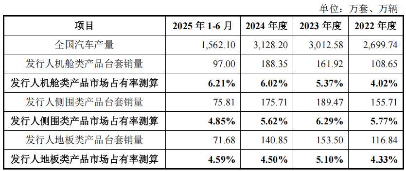 2025年1-6月至信股份机舱类产品、侧围类产品、地板类产品市场占有率分别为6.21%、4.85%和4.59%。
