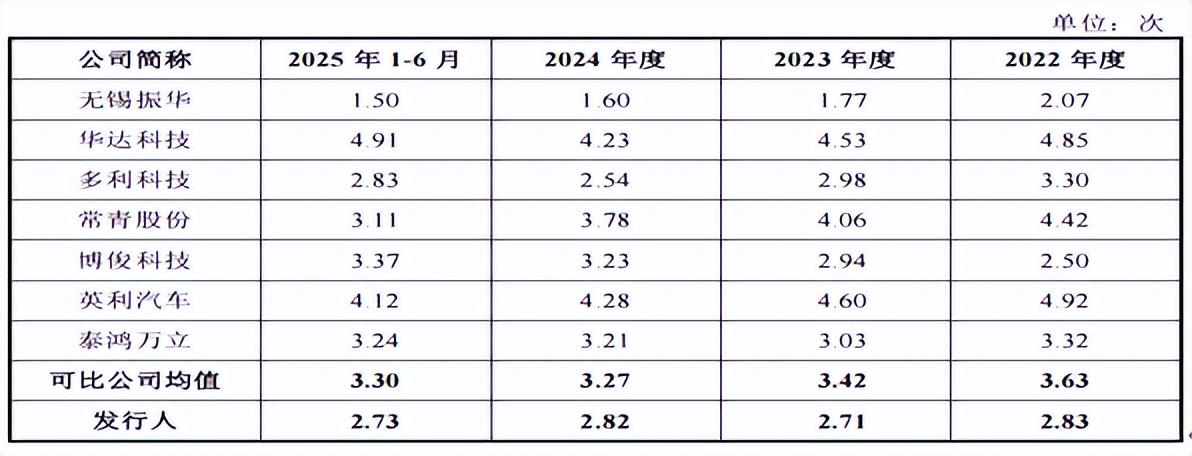 2022年-2025年1-6月,公司应收账款周转率分别为2.83、2.71、2.82和2.73,公司应收账款周转率低于同行业平均水平3.63、3.42、3.27和3.30。